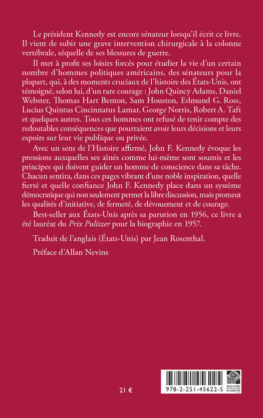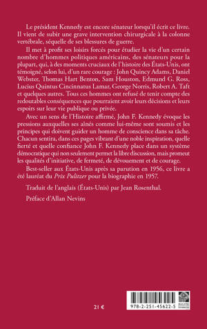 Avec un sens de l’Histoire affirmé, John F. Kennedy évoque les pressions auxquelles ses aînés comme lui-même sont soumis et les principes qui doivent guider un homme de conscience dans sa tâche. Chacun sentira, dans ces pages vibrant d’une noble inspiration, quelle fierté et quelle confiance John F. Kennedy place dans un système démocratique qui non seulement permet la libre discussion, mais promeut les qualités d’initiative, de fermeté, de dévouement et de courage.
