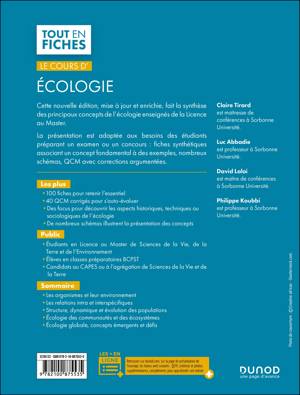 Cet ouvrage fait la synthèse des principaux concepts de l'écologie enseignés de la Licence au Master. La présentation est adaptée aux besoins des étudiants préparant un examen ou un concours: fiches synthétiques associant un concept fondamental à des exemples, nombreux schémas, QCM avec corrections argumentées. Les plus : - 100 fiches pour retenir l'essentiel. - 40 QCM corrigés pour s'auto-évaluer. - Des focus pour découvrir les aspects historiques, techniques ou sociologiques de l'écologie. - De nombreux schémas illustrent la présentation des concepts. - En fin de chapitre, des questions de révision permettent de s'auto-évaluer. - Des ressources numériques sur le site dunod.com.