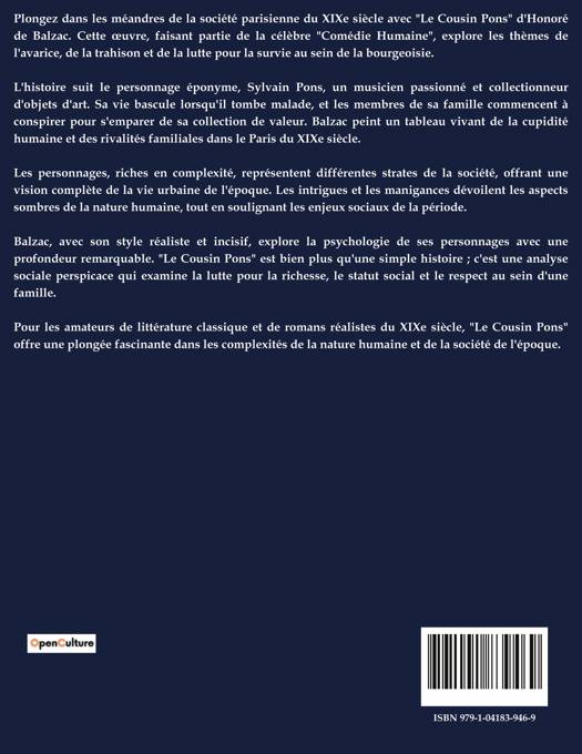 "Le Cousin Pons" est une oeuvre d'Honoré de Balzac qui s'inscrit dans le cycle de "La Comédie humaine". Ce roman explore les complexités des relations familiales et les dilemmes moraux dans le contexte de la société parisienne du XIXe siècle. L'histoire se concentre sur la famille Hulot, en particulier sur la baronne Adeline Hulot, une femme d'une beauté changeante et d'une vertu inébranlable, qui doit faire face aux infidélités et aux extravagances financières de son mari, le baron Hulot. Ce dernier, autrefois un homme admiré et respecté, s'est laissé entraîner dans une spirale de dépenses somptuaires pour entretenir ses maîtresses, mettant ainsi en péril la stabilité financière de sa famille. La baronne, confrontée à la nécessité de marier sa fille Hortense, se trouve dans une situation désespérée. Elle doit naviguer entre les avances indécentes de Crevel, un ancien parfumeur devenu prospère, et les réalités économiques qui menacent l'avenir de sa fille. Crevel, animé par un désir de vengeance contre le baron Hulot qui lui a ravi sa maîtresse, propose à Adeline un marché immoral pour assurer la dot d'Hortense. Adeline, fidèle à ses principes, rejette cette proposition, préférant préserver son honneur et celui de sa famille. À travers ce récit, Balzac dépeint avec acuité les tensions entre l'amour, l'honneur et l'argent, tout en critiquant les moeurs de la bourgeoisie parisienne. Le roman met en lumière les sacrifices personnels et les compromis que les individus sont prêts à faire pour protéger ceux qu'ils aiment, tout en soulignant les conséquences dévastatrices de l'orgueil et de la vanité.