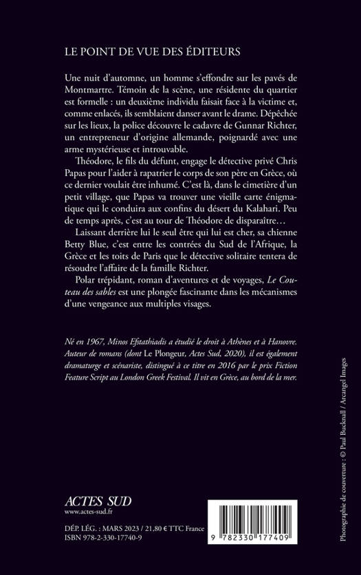 Une nuit d'automne, un homme s'effondre sur les pavés de Montmartre. Témoin de la scène, une résidente du quartier est formelle : un deuxième individu faisait face à la victime et, comme enlacés, ils semblaient danser avant le drame. Dépêchée sur les lieux, la police découvre le cadavre de Gunnar Richter, un entrepreneur d'origine allemande, poignardé avec une arme mystérieuse et introuvable. Théodore, le fils du défunt, engage le détective privé Chris Papas pour l'aider à rapatrier le corps de son père en Grèce, où ce dernier voulait être inhumé. C'est là, dans le cimetière d'un petit village, que Papas va trouver une vieille carte énigmatique qui le conduira aux confins du désert du Kalahari. Peu de temps après, c'est au tour de Théodore de disparaître... Laissant derrière lui le seul être qui lui est cher, sa chienne Betty Blue, c'est entre les contrées du Sud de l'Afrique, la Grèce et les toits de Paris que le détective solitaire tentera de résoudre l'affaire de la famille Richter. Polar trépidant, roman d'aventures et de voyages, "Le Couteau des sables" est une plongée fascinante dans les mécanismes d'une vengeance aux multiples visages.