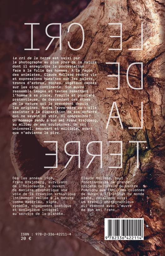 Le cri de la terre est saisi par le photographe au plus près de la nature dont il enregistre la protestation face à la folie des hommes. À la façon des animistes, Claude Mollard révèle vie et expressions humaines sur les galets, troncs d’arbres, roches, végétaux captés sur les cinq continents. Son œuvre rassemble images et textes remettant l’homme à sa place, fragile et pourtant prétentieuse, de descendant des êtres de la nature qui le précédent depuis les origines. Notre Terre-mère va-t-elle assister à la disparition de ses enfants qui ne savent ni voir, ni comprendre ?