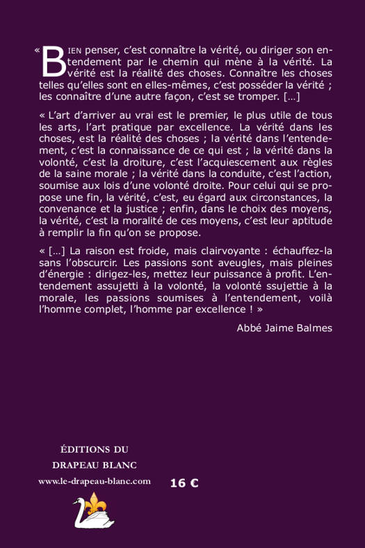 Bien penser, c'est connaître la vérité, ou diriger son entendement par le chemin qui mène à la vérité. La vérité est la réalité des choses. Connaître les choses telles qu'elles sont en elles-mêmes, c'est posséder la vérité, les connaître d'une autre façon, c'est se tromper. L'art d'arriver au vrai est le premier, le plus utile de tous les arts, l'art pratique par excellence. La vérité dans les choses, est la réalité des choses , la vérité dans l'entendement, c'est la connaissance de ce qui est, la vérité dans la volonté, c'est la droiture, c'est l'acquiescement aux règles de la saine morale, la vérité dans la conduite, c'est l'action, soumise aux lois d'une volonté droite. Pour celui qui se propose une fin, la vérité, c'est, eu égard aux circonstances, la convenance et la justice, enfin, dans le choix des moyens, la vérité, c'est la moralité de ces moyens, c'est leur aptitude à remplir la fin qu'on se propose.