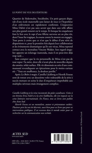 Quartier de Södermalm, Stockholm. Un petit garçon disparaît d'une école maternelle sans laisser de trace et l'hypothèse d'un enlèvement est rapidement confirmée. L'inspectrice Mina Dabiri n'est pas sans savoir que dans une telle affaire son plus grand ennemi est le temps. Et lorsque les enquêteurs font le lien avec le rapt d'une fillette survenu un an plus tôt, dont l'issue fut tragique, la course contre la montre est engagée. Tout porte à croire que ce n'est que le début d'une série de disparitions et, pour la première fois depuis leur collaboration et les événements dramatiques qu'ils ont vécus, Mina reprend contact avec le mentaliste Vincent Walder. Son regard singulier apporte un éclairage inattendu, mais il est peut-être déjà trop tard... Sans compter que la vie personnelle de Mina n'est pas de tout repos ! Sa mère, dont elle n'avait plus de nouvelles depuis des années, refait surface. Elle vit désormais au sein d'une communauté revendiquant un épicurisme pour le moins curieux où : "Tout est souffrance, la douleur purifie." Après "La Boîte à magie", Camilla Läckberg et Henrik Fexeus sont de retour avec un deuxième volet redoutable de la série à succès mettant en scène le duo d'enquêteurs improbable aux multiples névroses mais étrangement complice.