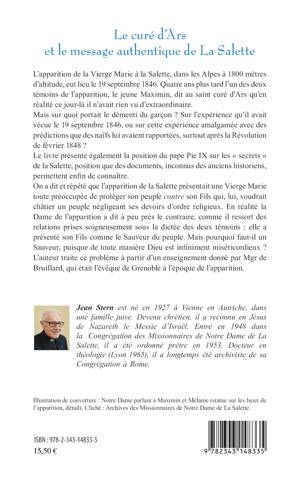 En parlant avec le jeune Maximin en septembre 1850, le saint curé d'Ars, sans s'en rendre compte, a mis le doigt sur l'origine des fameux secrets de la Salette. Le livre présente également la position de Pie IX sur les secrets” de la Salette, position que des documents, inconnus des anciens historiens, permettent enfin de connaître.
