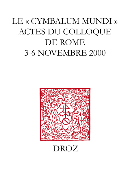 Sommaire: Avant-propos de F. Giacone; J. Céard, «Hommage à Michel Simonin». Ouverture: R. Cooper, «Cymbalum Mundi: état de la question»; Y. Giraud, «La lettre et l’esprit. Problèmes textuels et éditoriaux autour du Cymbalum Mundi». Histoire de Livres: M. Simonin, «Vol au dessus d’un nid de corbeaux: le prince, les lettres et le Cymbalum Mundi»; Ph. Desan, «La reliure du livre de Jupiter: lecture bibliologique du Cymbalum Mundi»; R. I. Vulcan, «Une cymbale du Cymbalum Mundi, le colportage»; F. M. Higman, «Le Cymbalum Mundi et la censure»; J. Roudaut, «La réception du Cymbalum Mundi: 1538-1824»; F. Giacone, «Une réception du Cymbalum Mundi en Allemagne au XVIIe siècle»; P. J. Smith, «Prosper Marchand et sa “Lettre critique sur le livre intitulé Cymbalum Mundi”»; G. Bedouelle, «Le Cymbalum Mundi au XIXe siècle»; F. Giacone, «D’un livre à l’autre: échos bibliques et théologiques dans le Cymbalum Mundi». Fables, mythes et symboles: J. Céard, «“Dialogues poétiques” ou la mythologie dans le Cymbalum Mundi»; R. Gorris-Camos, «Le bain de Diane: mythe et transmutation dans le Cymbalum Mundi»; M. Huchon, «Dialogue poétique et littérature mercurienne»; C. Bologna, «Lo spirito del Cymbalum Mundi»; F. Lestringant, «L’espace du Cymbalum Mundi»; B. Pinchard, «Un Pantagruélisme des Antipodes? Lecture comparée du Cymbalum Mundi et des mythologies Pantagruelicques»; B. Conconi, «Lettura di due leggende incrociate: Pietro Aretino e l’autore del Cymbalum Mundi»; J.-Cl. Carron, «L’énigme du Cymbalum Mundi: de l’allégorisation subversive au dialogue comique». Dialogue et théâtralité: O. Millet, «Le Cymbalum Mundi et la tradition lucianique»; Ch. Lauvergnat-Gagnière, «Le déguisement dans le Cymbalum Mundi»; B. Petey-Girard, «De l’usage du dialogue dans le Cymbalum Mundi: théâtralité, enseignement, réflexion»; D. Ménager, «L’ironie et l’humour dans le dialogue des chiens (Cymbalum Mundi IV)»; S. Bamforth, «Aspects théâtraux du Cymbalum Mundi»; E. Kushner, «L’inscription du second dialogue dans l’histoire du dialogue à la Renaissance»; V. Zaercher, «Voix et énonciation dans le Cymbalum Mundi»; Sens et non-sens: la parole en question: A. Tournon, «Exégèse par énigmes: l’épître liminaire du Cymbalum Mundi»; G. Patrizi, «I temi “italiani” del Cymbalum Mundi»; T. Peach, «Curiosité et conquête du vide dans le Cymbalum Mundi»; P. Tordjman, «Pour qui sonne la Cymbale? Quelques problèmes concernant le thème de l’efficacité symbolique dans le Cymbalum Mundi attribué à Des Périers»; O. Pot, «Le livre et la parole dans le Cymbalum Mundi: entre hommes et bêtes»; G. Polizzi, «Parole “vide” et parole ‘pleine’: l’«inquiétante étrangeté» du Cymbalum Mundi»; C. La Charité, «Inter pastorem et impostorem: l’augustinisme rhétorique et le Cymbalum Mundi (1537)»; M. Clément, «Le Cymbalum Mundi, un texte cynique?»; R. Rosenstein, «Cervantès et le Cymbalum Mundi: du loquax canum agmen à la rhétorique du silence»; R. Cooper, Conclusions. Appendices: A.W. Caswell, «Le paradoxe contre les lettres est-il un autre pamphlet de Thomas?»; G. Guilleminot, «Le dernier possesseur du Cymbalum Mundi de 1537»; Ch. Clavel et T. Tran Quoc , «Euge Sophos: synthèse de la devise et de l’image».,