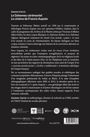 Tournés au Dahomey (Bénin actuel) en 1930 par le missionnaire et ethnologue Francis Aupiais avec son opérateur Frédéric Gadmer, dans le cadre du programme des Archives de la Planète créées par l’homme d’affaires Albert Kahn, les deux corpus filmiques “Le Dahomey chrétien” et “Le Dahomey religieux” distinguent nettement les rituels d’un monde “païen” et ceux d’un monde en cours de christianisation. En faisant dialoguer ces deux corpus, Gaetano Ciarcia interroge une histoire de la conversion africaine en situation coloniale. <br /> Pour Aupiais, les cérémonies vodun sont les traces d’une révélation monothéiste perdue que l’entreprise évangélisatrice se propose de régénérer. Ses mises en scène cinématographiques de la vie religieuse locale et des fêtes de la Sainte Jeanne d’Arc ou de l’Épiphanie sont ici analysées en tant qu’archives des rapports de domination, mais aussi de l’utopie d’un “nouveau monde ancien”, à la fois “traditionnel” et territoire catholique de l’empire français. <br /> Par sa reconnaissance ambiguë des qualités morales et esthétiques des coutumes populaires dahoméennes, l’oeuvre d’Aupiais présage l’avènement d’un imaginaire patrimonial du vodun au Bénin. À la suite d’enquêtes ethnographiques effectuées entre 2005 et 2012, la dernière partie de ce livre est consacrée à l’“après-Aupiais”: une généalogie allant des écrits et des images dont le missionnaire et d’autres ethnologues ont été les auteurs à l’institution contemporaine des cultes vodun comme supports d’une mémoire culturelle.