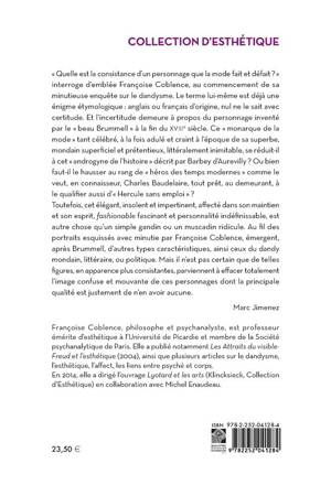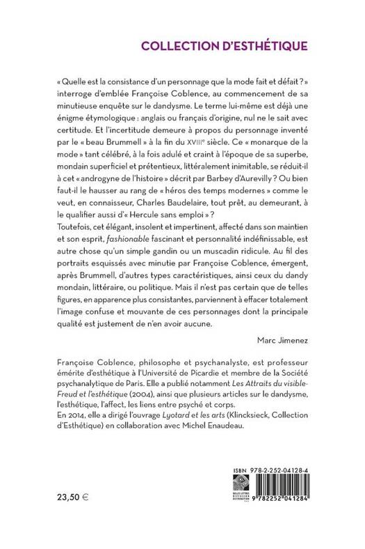Quelle est la consistance d'un personnage que la mode fait et defait ? interroge d'emblee Francoise Coblence, au commencement de sa minutieuse enquete sur le dandysme. Le terme lui-meme est deja une enigme etymologique: anglais ou francais d'origine, nul ne le sait avec certitude. Et l'incertitude demeure a propos du personnage invente par le beau Brummell a la fin du XVIIIe siecle. Ce monarque de la mode tant celebre, a la fois adule et craint a l'epoque de sa superbe, mondain superficiel et pretentieux, litteralement inimitable, se reduit-il a cet androgyne de l'histoire decrit par Barbey d'Aurevilly ? Ou bien faut-il le hausser au rang de heros des temps modernes comme le veut, en connaisseur, Charles Baudelaire, tout pret, au demeurant, a le qualifier aussi d' Hercule sans emploi ?Toutefois, cet elegant, insolent et impertinent, affecte dans son maintien et son esprit, fashionable fascinant et personnalite indefinissable, est autre chose qu'un simple gandin ou un muscadin ridicule. Au fil des portraits esquisses avec minutie par Francoise Coblence, emergent, apres Brummell, d'autres types caracteristiques, ainsi ceux du dandy mondain, litteraire, ou politique. Mais il n'est pas certain que de telles figures, en apparence plus consistantes, parviennent a effacer totalement l'image confuse et mouvante de ces personnages dont la principale qualite est justement de n'en avoir aucune. Marc Jimenez
