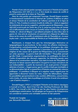 Premier d'une serie de quatre ouvrages consacres a l'histoire de la guerre du Peloponnese (431-404 av. J.-C.), ce livre etudie les causes du conflit et prend le contre-pied de la these de Thucydide. Dans les cinq parties qui composent l'ouvrage, Donald Kagan examine le fonctionnement institutionnel et informel des systemes d'alliance en place et retrace l'histoire de la constitution de l'alliance spartiate et de la ligue de Delos (1). Puis, il restitue le contexte trouble du milieu du ve siecle en rappelant les evenements de ce qu'on a appele la premiere guerre du Peloponnese (vers 460-445) et de la paix de Trente Ans (2 et 3), jusqu'aux trois crises de l'annee 433 (l'affrontement entre Corcyre et Corinthe autour d'Epidamne, le siege de Potidee, le decret de Megare ) qui allaient precipiter les deux blocs dans la guerre (4). Une serie de conclusions (5) examinent et critiquent les differentes theses sur les causes du conflit, et notamment celles de Thucydide sur la cause la plus vraie , sur la responsabilite de Pericles et sur l'ineluctabilite de la guerre. Restituant, a chaque fois que les temoignages litteraires et epigraphiques le permettent, le lien entre les affaires interieures, l'organisation constitutionnelle et la politique etrangere des cites concernees, Donald Kagan examine a nouveaux frais la question des origines et des causes de la guerre du Peloponnese en se concentrant sur cette question: la guerre etait-elle inevitable? Thucydide pensait qu'elle l'etait. L'organisation argumentative, les antilogies, le choix et l'ordre d'exposition des discours rapportes, les elements passes sous silence et la construction narrative, tout dans le texte de Thucydide est fait pour ne laisser aucune alternative a la guerre et nous convaincre de son ineluctabilite a partir du moment ou on avait permis a l'empire athenien d'exister. Kagan pense que le conflit n'etait pas inevitable et sa demonstration fait de ce grand livre d'histoire un manuel de sciences politiques: il contribue a eduquer et a aiguiser notre regard pour lui apprendre a discerner toutes les voies, toutes les bifurcations, toutes les possibilites qui permettent a des societes differentes, concurrentes, voire rivales, de rester dans la politique et d'eviter d'avoir a la continuer par d'autres moyens .