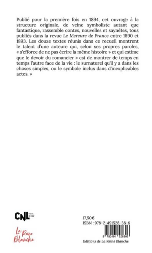 Publié pour la première fois en 1894, cet ouvrage à la structure originale, de veine symboliste autant que fantastique, rassemble contes, nouvelles et saynètes, tous publiés dans la revue Le Mercure de France entre 1890 et 1893. Les douze textes réunis dans ce recueil montrent le talent d’une auteure qui, selon ses propres paroles, « s’efforce de ne pas écrire la même histoire » et qui estime que le devoir du romancier « est de montrer de temps en temps l’autre face de la vie : le surnaturel qu’il y a dans les choses simples, ou le symbole inclus dans d’inexplicables actes. »Cette édition a reçu le soutien du Centre National du Livre.