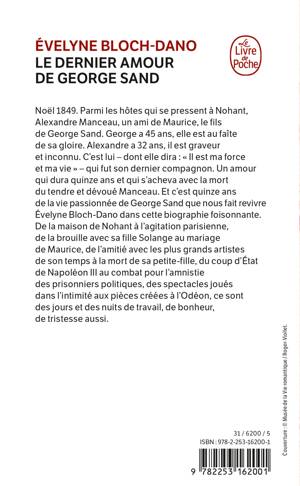 Noël 1849. Parmi les hôtes qui se pressent à Nohant, Alexandre Manceau, un ami de Maurice, le fils de George Sand. George a 45 ans, elle est au faîte de sa gloire. Alexandre a 32 ans, il est graveur et inconnu. C’est lui – dont elle dira : « Il est ma force et ma vie » - qui fut son dernier compagnon. Un amour qui dura quinze ans et qui s’acheva avec la mort du tendre et dévoué Manceau. Et c’est quinze ans de la vie passionnée de George que nous fait revivre Evelyne Bloch-Dano dans cette biographie foisonnante. De la maison de Nohant à l'agitation parisienne, de la brouille avec sa fille Solange au mariage de Maurice, de l'amitié avec les plus grands artistes de son temps à la mort de sa petite-fille, du coup d'Etat de Napoléon III au combat pour l'amnistie des prisonniers politiques, des spectacles joués dans l'intimité aux pièces créées à l'Odéon, ce sont des jours et des nuits de travail, de bonheur, de tristesse aussi.