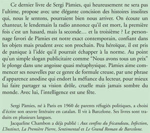 Sergi Pàmies, né à Paris en 1960 de parents réfugiés politiques, a choisi d'écrire son oeuvre littéraire en catalan. Il vit à Barcelone. Ses livres sont traduits en plusieurs langues. Jacqueline Chambon a déjà publié : «Aux confins du fricandeau, Infection, L'Instinct, La Première Pierre, Sentimental »et« Le Grand Roman de Barcelone».
