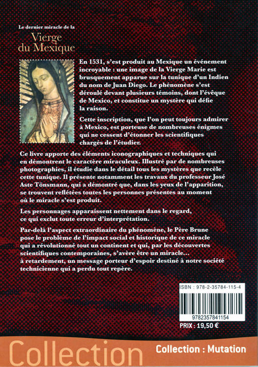 En 1531, s'est produit au Mexique un événement incroyable : une image de la Vierge Marie est brusquement apparue sur la tunique d'un Indien du nom de Juan Diego. Le phénomène s'est produit devant l'évêque de Mexico et constitue, depuis, un mystère qui défie la Raison car aucune analyse scientifique n'est parvenue à fournir une explication de ce miracle que l'on peut toujours admirer à Mexico. Ce livre apporte des éléments iconographiques et techniques démontrant le caractère miraculeux de cette «apparition». Illustré par de nombreuses photographies, dont soixante en couleur, il étudie dans le détail tous les mystères que recèle cette tunique. Il présente notamment les travaux d'un scientifique péruvien, le professeur José Aste Tönsmann, qui a démontré que, dans les yeux de l'apparition, se trouvent reflétées toutes les personnes présentes face au phénomène lorsque le miracle s'est produit. Les personnages apparaissent nettement dans les deux yeux, ce qui exclut toute erreur d'interprétation. Par-delà l'aspect extraordinaire du phénomène, le Père Brune pose le problème de l'impact social et historique de ce miracle qui a révolutionné tout un continent et qui, par les découvertes scientifiques contemporaines, s'avère être un miracle... à retardement, un message porteur d'espoir destiné à notre société technicienne qui a perdu tout repère.