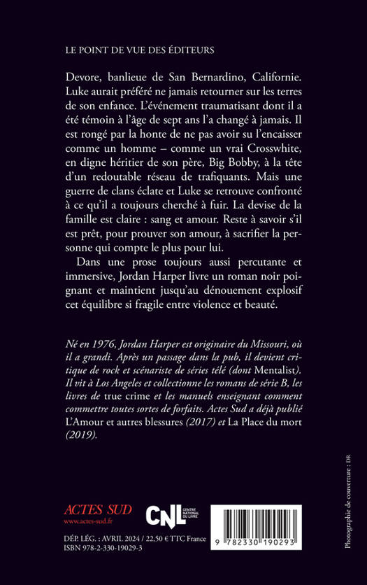 Devore, banlieue de San Bernardino, Californie. Luke aurait préféré ne jamais retourner sur les terres de son enfance. L'événement traumatisant dont il a été témoin à l'âge de sept ans l'a changé à jamais. Il est rongé par la honte de ne pas avoir su l'encaisser comme un homme - comme un vrai Crosswhite, en digne héritier de son père, Big Bobby, à la tête d'un redoutable réseau de trafiquants. Mais une guerre de clans éclate et Luke se retrouve confronté à ce qu'il a toujours cherché à fuir. La devise de la famille est claire : sang et amour. Reste à savoir s'il est prêt, pour prouver son amour, à sacrifier la personne qui compte le plus pour lui.