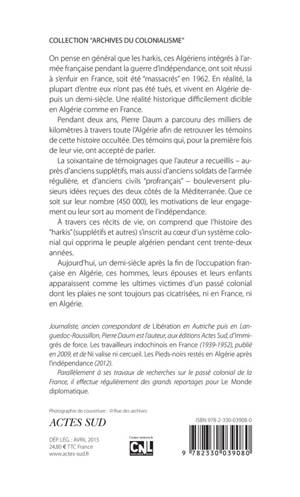 La soixantaine de témoignages que l'auteur a recueillis - auprès d'anciens supplétifs, mais aussi d'anciens soldats de l'armée régulière, et d'anciens civils "profrançais" - bouleversent plusieurs idées reçues des deux côtés de la Méditerranée. Que ce soit sur leur nombre (450 000), les motivations de leur engagement ou leur sort au moment de l'indépendance.