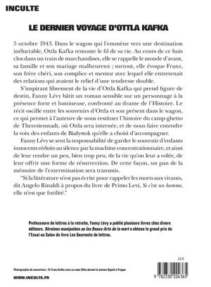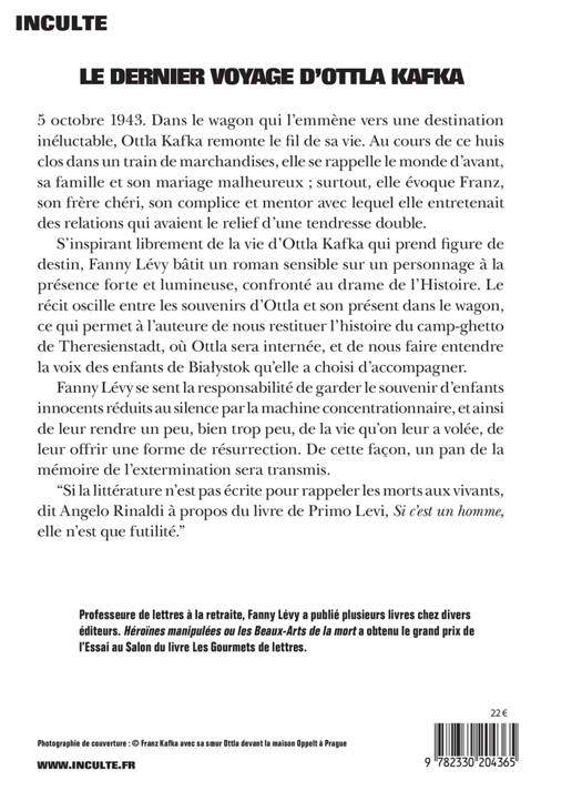 5 octobre 1943. Dans le wagon qui l'emmène vers une destination inéluctable, Ottla Kafka remonte le fil de sa vie. Au cours de ce huis clos dans un train de marchandises, elle se rappelle le monde d'avant, sa famille et son mariage malheureux ; surtout, elle évoque Franz, son frère chéri, son complice et mentor avec lequel elle entretenait des relations qui avaient le relief d'une tendresse double. S'inspirant librement de la vie d'Ottla Kafka qui prend figure de destin, Fanny Lévy bâtit un roman sensible sur un personnage à la présence forte et lumineuse, confronté au drame de l'Histoire. Le récit oscille entre les souvenirs d'Ottla et son présent dans le wagon, ce qui permet à l'auteure de nous restituer l'histoire du camp-ghetto de Theresienstadt, où Ottla sera internée, et de nous faire entendre la voix des enfants de Białystok qu'elle a choisi d'accompagner. Fanny Lévy se sent la responsabilité de garder le souvenir d'enfants innocents réduits au silence par la machine concentrationnaire, et ainsi de leur rendre un peu, bien trop peu, de la vie qu'on leur a volée, de leur offrir une forme de résurrection. De cette façon, un pan de la mémoire de l'extermination sera transmis. "Si la littérature n'est pas écrite pour rappeler les morts aux vivants, dit Angelo Rinaldi à propos du livre de Primo Levi, "Si c'est un homme", elle n'est que futilité."