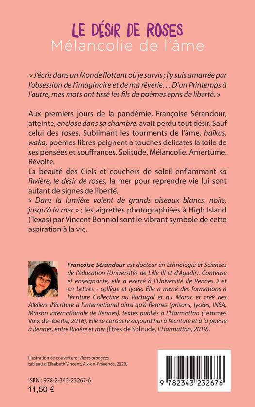 « J’écris dans un Monde flottant où je survis ; j’y suis amarrée par l’obsession de l’imaginaire et de ma rêverie... D’un Printemps à l’autre, mes mots ont tissé les fils de poèmes épris de liberté. » Aux premiers jours de la pandémie, Françoise Sérandour, atteinte, enclose dans sa chambre, avait perdu tout désir. Sauf celui des roses. Sublimant les tourments de l’âme, haïkus, waka, poèmes libres peignent à touches délicates la toile de ses pensées et souffrances. Solitude. Mélancolie. Amertume. Révolte. La beauté des Ciels et couchers de soleil enflammant sa Rivière, le désir de roses, la mer pour reprendre vie lui sont autant de signes de liberté. « Dans la lumière volent de grands oiseaux blancs, noirs, jusqu’à la mer » ; les aigrettes photographiées à High Island (Texas) par Vincent Bonniol sont le vibrant symbole de cette aspiration à la vie.