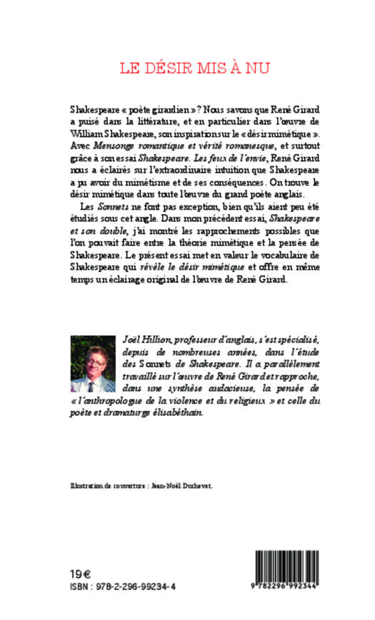 Dans un précédent essai, l'auteur a démontré les rapprochements possibles entre la théorie mimétique et la pensée de Shakespeare. Il prolonge ici sa pensée en mettant en valeur le vocabulaire de Shakespeare qui révèle le désir mimétique et offre en même temps un éclairage original de l'oeuvre de René Girard.