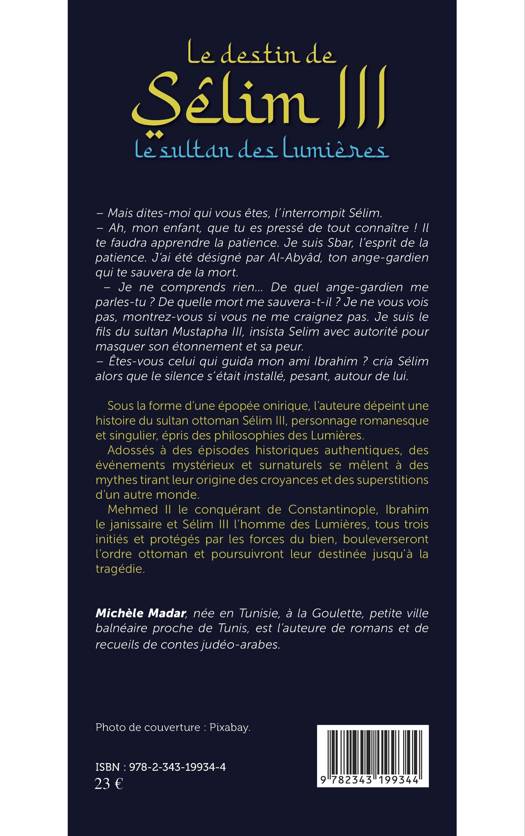 Sous la forme d'une épopée onirique, l'auteure dépeint une histoire du sultan ottoman Sélim III, personnage romanesque et singulier, épris des philosophies des Lumières. Adossés à des épisodes historiques authentiques, des événements mystérieux et surnaturels se mêlent à des mythes tirant leur origine des croyances et des superstitions d'un autre monde. Mehmed II le conquérant de Constantinople, Ibrahim le janissaire et Sélim III l'homme des Lumières, tous trois initiés et protégés par les forces du bien, bouleverseront l'ordre ottoman et poursuivront leur destinée jusqu'à la tragédie.