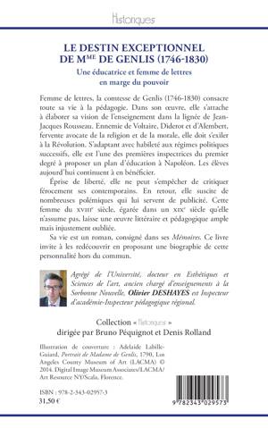 Femme de lettres, la comtesse de Genlis (1746-1830) consacre toute sa vie à la pédagogie. S’adaptant avec habileté aux régimes politiques successifs, elle est l’une des premières inspectrices du premier degré à proposer un plan d’éducation à Napoléon. Sa vie est un roman, consigné dans ses Mémoires. Ce livre invite à les redécouvrir en proposant une biographie de cette personnalité hors du commun.
