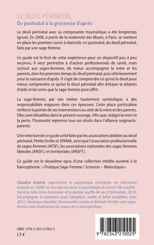 Le deuil périnatal avec sa composante traumatique a été longtemps ignoré. En 2008, à partir de la maternité des Bluets, à Paris, se mettent en place les premiers suivis à domicile, en postnatal, du deuil périnatal, faits par une sage-femme. Ce guide est le fruit de cette expérience pour un dispositif peu à peu reconnu. Il veut permettre à d'autres professionnels de santé, mais surtout aux sages-femmes, de mieux accompagner la mère et les parents, dans les premiers temps du deuil périnatal, puis ultérieurement pour la naissance d'après.