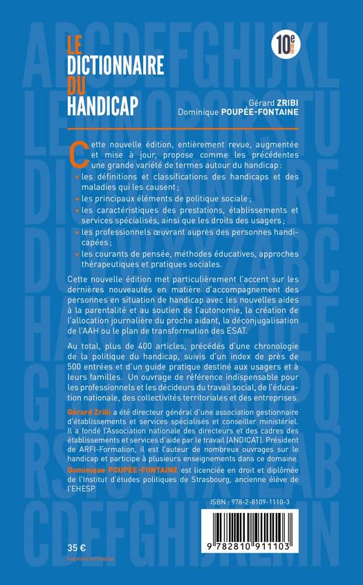 Cette nouvelle édition, entièrement revue, augmentée et mise à jour, propose comme les précédentes une grande variété de termes autour du handicap : - les définitions et classifications des handicaps et des maladies qui les causent ; - les principaux éléments de politique sociale ; - les caractéristiques des prestations, établissements et services spécialisés, ainsi que les droits des usagers ; - les professionnels oeuvrant auprès des personnes handicapées ; - les courants de pensée, méthodes éducatives, approches thérapeutiques et pratiques sociales. Au total, plus de 400 articles, précédés d’une brève chronologie de la politique du handicap, suivis d’un index de près de 500 entrées et d’un guide pratique destiné aux usagers et à leurs familles. Un ouvrage de référence indispensable pour les professionnels et les décideurs du travail social, de l’éducation nationale, des collectivités territoriales et des entreprises.