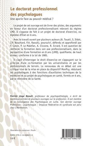 Le projet de cet ouvrage est de livrer des pistes, des arguments en faveur d'un doctorat professionnalisant relevant du régime LMD. Il s'oppose de fait à un projet de doctorat d'exercice, ou diplôme d'État en 6 ans. Avec le travail ouvert par plusieurs auteurs (A. Touati, S. Sidot, J.P. Bouchard, P.A. Raoult), poursuivi, défendu et approfondi par F. Caron, P. Le Malefan, A. Ciccone, R. Evrard, il est question de renforcer la formation dans son axe professionnalisant, dans la perspective d'une formation en 8 ans (LMD), qualifiante, de haut niveau, conforme à la loi de 1985. Il s'agit d'interroger le droit d'exercice en s'appuyant sur le principe d'une co-formation par les universitaires et par les professionnels de terrain. Le renouveau de ce débat est une critique vive de la mise en place du dispositif MonPsy, réduisant les psychologues à des fonctions d'auxiliaires techniques de la médecine et au projet de psychologues en santé, formés en 6 ans, par le ministère de la Santé.
