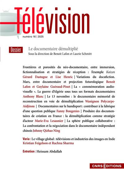 Le documentaire est aujourd'hui partout : sur nos écrans de télévision, bien sûr, mais aussi, plus largement, sur l'ensemble des services de médias audiovisuels et sur les plateformes. Cette démultiplication ne va pas sans de nouveaux formats, de l'unitaire au sériel, de la télévision au cinéma, des festivals aux chaînes YouTube. Les documentaires sont aujourd'hui aux prises avec des enjeux esthétiques et artistiques, politiques et éditoriaux, ou encore professionnels et économiques.