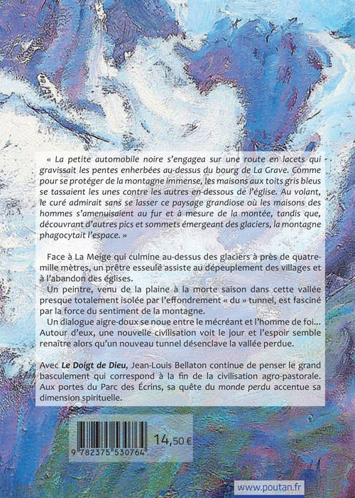 « La petite automobile noire s’engagea sur une route en lacets qui gravissait les pentes enherbées au-dessus du bourg de La Grave. Comme pour se protéger de la montagne immense, les maisons aux toits gris bleus se tassaient les unes contre les autres en-dessous de l’église. Au volant, le curé admirait sans se lasser ce paysage grandiose où les maisons des hommes s’amenuisaient au fur et à mesure de la montée, tandis que, découvrant d’autres pics et sommets émergeant des glaciers, la montagne phagocytait l’espace. » Face à La Meige qui culmine au-dessus des glaciers à près de quatre-mille mètres, un prêtre esseulé assiste au dépeuplement des villages et à l’abandon des églises. Un peintre, montée de la plaine à la morte saison dans cette vallée presque complètement isolée par l’effondrement « du » tunnel, est faciné par la force de la lumière. Un dialogue mi-figue mi-raisin se noue entre le mécréant et l’homme de foi... Autour d’eux, une nouvelle civilisation semble voir le jour et l’espoir renaître tandis qu’un nouveau tunnel désenclave la vallée perdue. Avec Le Doigt de Dieu, Jean-Louis Bellaton continue de penser le grand basculement qui correspond à la fin de la civilisation agro-pastorale. Et, aux portes du Parc des écrins, sa quête du monde perdu accentue sa dimension spirituelle.