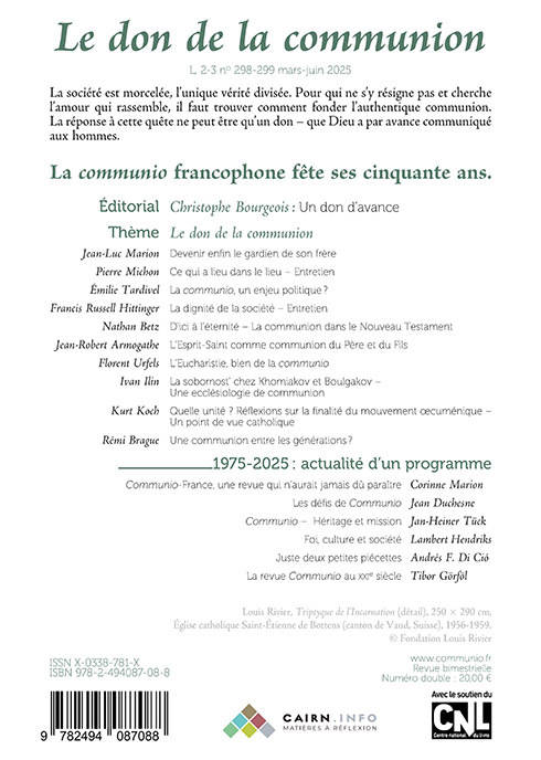 La société est morcelée, l'unique vérité divisée. Pour qui ne s'y résigne pas et cherche l'amour qui rassemble, il faut trouver comment fonder l'authentique communion. La réponse à cette quête ne peut être qu'un don – que Dieu a par avance communiqué aux hommes. Pour fêter ses cinquante ans, l'édition francophone de Communio (1975-2025) revient sur cette intuition de Hans Urs von Balthasar. Avec les contributions de Rémi Brague, Jean-Luc Marion, Émilie Tardivel, Jean—Robert Armogathe, Florent Urfels, Nathan Betz, Christophe Bourgeois, Ivan Ilin et le cardinal Kurt Koch. Deux entretiens exceptionnels, avec l'écrivain Pierre Michon et avec Francis Russell Hittinger. Pour compléter ce numéro-anniversaire, plusieurs contributions françaises et étrangères évoquent l'actualité du programme de Communio pour répondre aux défis contemporains – avec notamment des articles de Corinne Marion, Jean Duchesne, Jan-Heiner Tück, Lambert Hendricks, Andres di Ció, Tibor Görföl.
