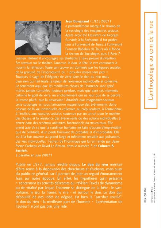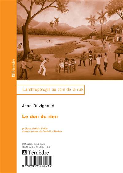 Publié en 1977, jamais réédité depuis. Le don du rien méritait d'être remis à la disposition des chercheurs et étudiants, mais aussi du public en général, car il permet de jeter un regard étonnamment frais sur notre époque. En effet, les hypothèses qu'il présente " concernant les activités délirantes qui révèlent l'excès de dynamisme ou de vitalité par lequel l'homme se distingue de la bête : le symbolisme, le jeu, la transe, le rire et surtout le don. Le don qui, dépouillé de nos idées de négoce, est bien le "sacrifice inutile", le don du rien, la meilleure part de l'homme " ( présentation de l'auteur) n'ont pas pris une ride.