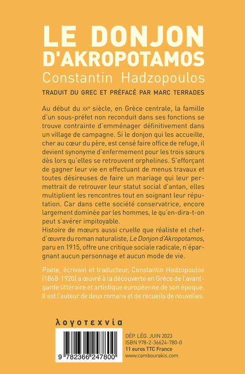Au début du xxe siècle, en Grèce centrale, la famille d'un sous-préfet non reconduit dans ses fonctions se trouve contrainte d'emménager définitivement dans un village de campagne. Si le donjon qui les accueille, cher au coeur du père, est censé faire office de refuge, il devient synonyme d'enfermement pour les trois soeurs dès lors qu'elles se retrouvent orphelines. S'efforçant de gagner leur vie en effectuant de menus travaux et toutes désireuses de faire un mariage qui leur permettrait de retrouver leur statut social d'antan, elles multiplient les rencontres tout en soignant leur réputation. Car dans cette société conservatrice, encore largement dominée par les hommes, le qu'en-dira-t-on peut s'avérer impitoyable. Histoire de moeurs aussi cruelle que réaliste et chef-d'oeuvre du roman naturaliste, Le Donjon d'Akropotamos, paru en 1915, offre une critique sociale radicale, n'épargnant aucun personnage et aucun mode de vie.