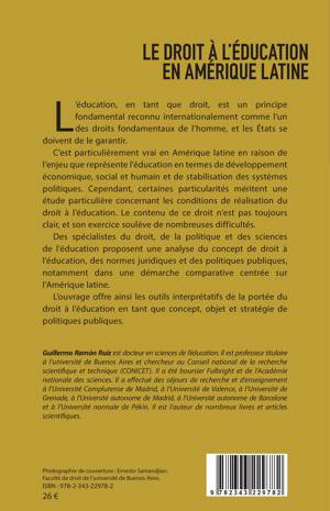 L'éducation, en tant que droit, est un principe fondamental reconnu internationalement comme l'un des droits fondamentaux de l'homme, et les États se doivent de le garantir. C'est particulièrement vrai en Amérique latine en raison de l'enjeu que représente l'éducation en termes de développement économique, social et humain et de stabilisation des systèmes politiques. Cependant, certaines particularités méritent une étude particulière concernant les conditions de réalisation du droit à l'éducation. Le contenu de ce droit n'est pas toujours clair, et son exercice soulève des difficultés. Des spécialistes du droit, de la politique et des sciences de l'éducation proposent une analyse du concept de droit à l'éducation, des normes juridiques et des politiques publiques, notamment dans une démarche comparative centrée sur l'Amérique latine. L'ouvrage offre ainsi les outils interprétatifs de la portée du droit à l'éducation en tant que concept, objet et stratégie de politiques publiques.