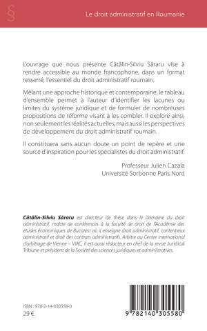 Cet ouvrage vise à rendre accessible au monde francophone, dans un format resserré, l'essentiel du droit administratif roumain. Mêlant une approche historique et contemporaine, le tableau d'ensemble permet à l'auteur d'identifier les lacunes ou limites du système juridique et de formuler de nombreuses propositions de réforme visant à les combler. Il explore ainsi, non seulement les réalités actuelles, mais aussi les perspectives de développement du droit administratif roumain. Il constituera sans aucun doute un point de repère et une source d'inspiration pour les spécialistes du droit administratif.