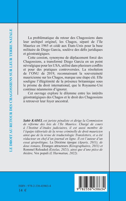 La problématique du retour des Chagossiens dans leur archipel originel, les Chagos, séparé de l'île Maurice en 1965 et cédé aux États-Unis pour la base militaire de Diego Garcia, soulève des défis juridiques et géostratégiques. Cette cession, synonyme de déplacement forcé des Chagossiens, a transformé Diego Garcia en un point névralgique pour les USA, utilisé dans plusieurs conflits et pour des pratiques controversées. La résolution de l'ONU de 2019, reconnaissant la souveraineté mauricienne sur les Chagos, marque une étape clé. Elle souligne l'illégitimité de la présence britannique sous le prisme du droit international, que le Royaume-Uni continue néanmoins d'ignorer. Cet ouvrage explore le dilemme entre les intérêts géostratégiques des Chagos et le droit des Chagossiens à retrouver leur foyer ancestral.