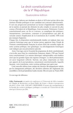 Cet ouvrage de référence s'adresse aux étudiants en droit et AES, aux élèves des instituts d'études politiques et aux candidats aux concours administratifs. Il couvre l'essentiel du programme de droit constitutionnel, c'est-à-dire aussi bien les constitutions françaises depuis 1789 que l'actuel texte constitutionnel. Cette nouvelle édition tient compte des derniers développements induits par les changements politiques, des dernières réformes des règlements des assemblées et de la jurisprudence la plus récente (19 juin 2020).