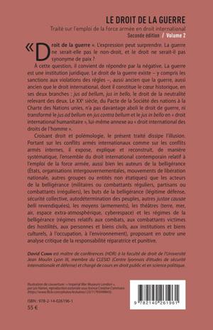 « Droit de la guerre ». L’expression peut surprendre. La guerre ne serait-elle pas le non-droit, et le droit ne serait-il pas synonyme de paix ? À cette question, il convient de répondre par la négative. La guerre est une institution juridique. Le droit de la guerre existe, aussi ancien que la guerre et que le droit international, dont il constitue le coeur historique. Le XXe siècle, du Pacte de la Société des nations à la Charte des Nations unies, n’a pas davantage aboli le droit de guerre, ni transformé le jus ad bellum en jus contra bellum et le jus in bello en « droit international humanitaire ». Croisant droit et polémologie, le présent traité dissipe l’illusion. Portant sur les conflits armés internationaux comme sur les conflits armés internes, il expose, explique et reconstruit, l’ensemble du droit international contemporain relatif à l’emploi de la force armée, aussi bien les auteurs de la belligérance que ses acteurs, ses buts et moyens, ses théâtres d'opération et ses régimes, proposant en outre une analyse critique de la responsabilité réparatrice et punitive.