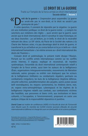 « Droit de la guerre ». L’expression peut surprendre. La guerre ne serait-elle pas le non-droit, et le droit ne serait-il pas synonyme de paix ? À cette question, il convient de répondre par la négative. La guerre est une institution juridique. Le droit de la guerre existe, aussi ancien que la guerre et que le droit international, dont il constitue le coeur historique. Le XXe siècle, du Pacte de la Société des nations à la Charte des Nations unies, n’a pas davantage aboli le droit de guerre, ni transformé le jus ad bellum en jus contra bellum et le jus in bello en « droit international humanitaire ». Croisant droit et polémologie, le présent traité dissipe l’illusion. Portant sur les conflits armés internationaux comme sur les conflits armés internes, il expose, explique et reconstruit, l’ensemble du droit international contemporain relatif à l’emploi de la force armée, aussi bien les auteurs de la belligérance que ses acteurs, ses buts et moyens, ses théâtres d'opération et ses régimes, proposant en outre une analyse critique de la responsabilité réparatrice et punitive.