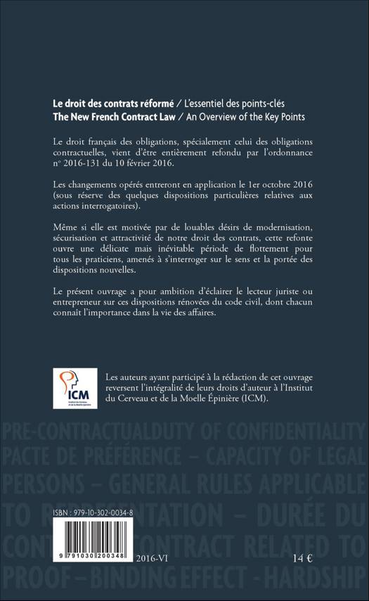 Le droit français des obligations, spécialement celui des obligations contractuelles, vient d'être entièrement refondu par l'ordonnance n°2016-131 du 10 février 2016. Les changements opérés entreront en application le 1er octobre 2016 (sous réserve des quelques dispositions particulières relatives aux actions interrogatoires). Même si elle est motivée par de louables désirs de modernisation, sécurisation et attractivité de notre droit des contrats, cette refonte ouvre une délicate mais inévitable période de flottement pour tous les praticiens, amenés à s'interroger sur le sens et la portée des dispositions nouvelles. Le présent ouvrage a pour ambition d'éclairer le lecteur juriste ou entrepreneur sur ces dispositions rénovées du Code civil, dont chacun connaît l'importance dans la vie des affaires.