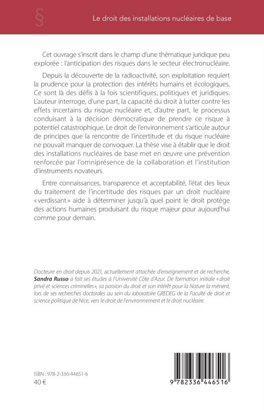 Cet ouvrage s'inscrit dans le champ d'une thématique juridique peu explorée l'anticipation des risques dans le secteur électronucléaire. Depuis la découverte de la radioactivité, son exploitation requiert la prudence pour la protection des intérêts humains et écologiques. Ce sont là des défis à la fois scientifiques, politiques et juridiques. L'auteur interroge, d'une part, la capacité du droit à lutter contre les effets incertains du risque nucléaire et, d'autre part, le processus conduisant à la décision démocratique de prendre ce risque à potentiel catastrophique. Le droit de l'environnement s'articule autour de principes que la rencontre de l'incertitude et du risque nucléaire ne pouvait manquer de convoquer. La thèse vise à établir que le droit des installations nucléaires de base met en oeuvre une prévention renforcée par l'omniprésence de la collaboration et l'institution d'instruments novateurs. Entre connaissances, transparence et acceptabilité, l'état des lieux du traitement de l'incertitude des risques par un droit nucléaire verdissant aide à déterminer jusqu'à quel point le droit protège des actions humaines produisant du risque majeur pour aujourd'hui comme pour demain.