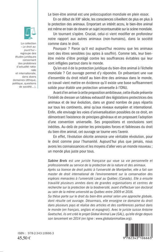 En ce début de XXIe siècle, les consciences s'éveillent de plus en plus à la protection des animaux. La société reconnaît aujourd'hui la sensibilité de ces êtres vivants et le droit à la protection de leur bien-être contre les souffrances évitables qui leur sont infligées. Un tournant s'opère et modifie profondément notre rapport aux animaux dans la société comme dans le droit. Cet ouvrage fait état de la protection juridique du bien-être animal à l'échelle mondiale et de la possibilité d'établir une protection universelle à l'ONU.