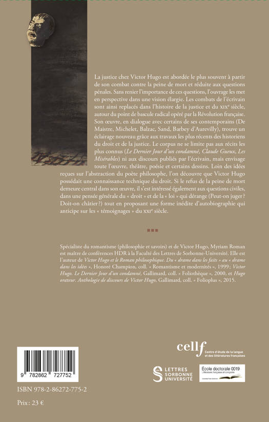 La justice chez Victor Hugo est abordée le plus souvent à partir de son combat contre la peine de mort et réduite aux questions pénales. Sans renier l'importance de ces questions, l'ouvrage les met en perspective dans une vision élargie. Les combats de l'écrivain sont ainsi replacés dans l'histoire de la justice et du XIXe siècle, autour du point de bascule radical opéré par la Révolution française. Son oeuvre, en dialogue avec certains de ses contemporains (De Maistre, Michelet, Balzac, Sand, Barbey d'Aurevilly), trouve un éclairage nouveau grâce aux travaux les plus récents des historiens du droit et de la justice. Le corpus ne se limite pas aux récits les plus connus (Le Dernier Jour d'un condamné, Claude Gueux, Les Misérables) ni aux discours publiés par l'écrivain, mais envisage toute l'oeuvre, théâtre, poésie et certains dessins. Loin des idées reçues sur l'abstraction du poète philosophe, l'on découvre que Victor Hugo possédait une connaissance technique du droit. Si le refus de la peine de mort demeure central dans son oeuvre, il s est intéressé également aux questions civiles, dans une pensée générale du « droit » et de la « loi » qui dérange (Peut-on juger ? Doit-on châtier ? ) tout en proposant une forme inédite d'autobiographie qui anticipe sur les « témoignages » du XXIe siècle.