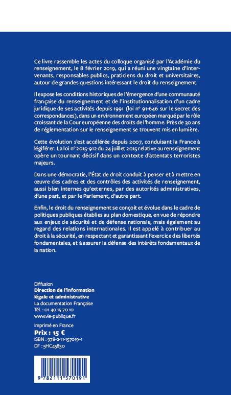 Ce livre rassemble les actes du colloque organisé par l'Académie du renseignement, le 8 février 2019, qui a réuni une vingtaine d'intervenants, responsables publics, praticiens du droit et universitaires, autour de grandes questions intéressant le droit du renseignement.