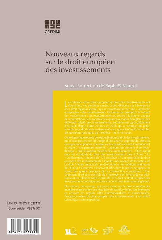 L'ouvrage rassemble les actes du colloque organisé les 5 et 6 décembre 2022 à l'Université de Bourgogne sur le thème "Nouveaux regards sur le droit européens des investissements".