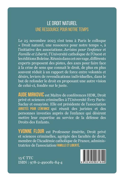 Le 25 novembre 2023 s'est tenu à Paris le colloque Droit naturel, une ressource pour notre temps", à l'initiative des associations Juristes pour l'enfance et Famille et liberté, de l'Université catholique de l'Ouest et des éditions Boleine. Réunis dans cet ouvrage, différents experts proposent des pistes, des axes pour faire face à la crise de sens que connaît le droit de plus en plus souvent réduit à un rapport de force entre volontés et désirs, à un simple levier pour soutenir des revendications individuelles dans le but de refonder le droit en proposant une autre vision de celui-ci, fondée sur le juste."