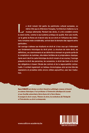 Cet ouvrage s'adresse aux étudiants en droit et à tous ceux qui s'intéressent aux fondements historiques du droit privé. La structure de notre droit, ses définitions, ses raisonnements et ses distinctions viennent en grande partie de la compilation de Justinien, elle-même héritière de la jurisprudence classique. Après avoir décrit le cadre historique du droit romain et ses sources, l'ouvrage présente le droit des personnes, les successions, le droit des biens et le droit des obligations à travers l'étude des contrats et de la responsabilité contractuelle. Il contient également un tableau chronologique ainsi qu'une liste des expressions et proverbes latins encore utilisés aujourd'hui, avec leur traduction.