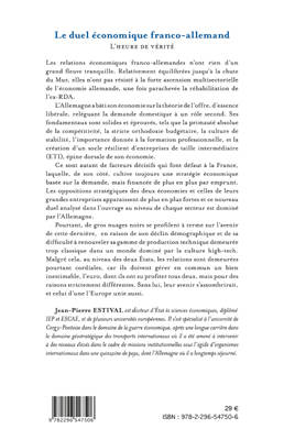 Les relations économiques franco-allemandes n'ont rien d'un long fleuve tranquille. Relativement équilibrées jusqu'à la chute du Mur, elles n'ont pas résisté à la forte ascension multisectorielle de l'économie allemande, une fois parachevée la réhabilitation de l'ex-RDA. Les relations sont demeurées pourtant cordiales au niveau des deux Etats, car ils doivent gérer en commun un bien inestimable, l'euro, dont ils ont su profiter tous deux, pour des raisons strictement différentes.