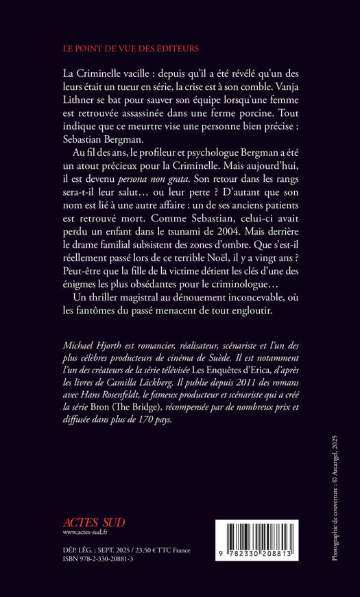 Depuis qu'il a été révélé au grand jour qu'un des leurs était un tueur en série, la crise menace de tout emporter au sein de la police criminelle. Vanja Lithner se bat pour sauver son équipe lorsqu'une femme d'une soixantaine d'années est retrouvée assassinée dans une ferme porcine près de Västerås. Tout indique que ce meurtre vise une personne bien précise : Sebastian Bergman. Pendant ce temps, Tim Cunningham, ancien patient de Bergman, est retrouvé mort. Comme Sebastian, Tim a perdu un être cher dans le tsunami de 2004. Mais derrière le drame familial se cachent des zones d'ombre. Que s'est-il réellement passé ce Noël-là, il y a presque vingt ans ? Hjorth & Rosenfeldt frappent à nouveau avec ce dernier opus de leur série phénomène consacrée au profileur Sebastian Bergman.