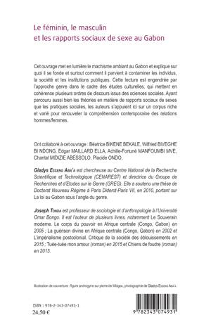 Cet ouvrage met en lumière le machisme ambiant au Gabon et explique sur quoi il se fonde et surtout comment il parvient à contaminer les individus, la société et les institutions publiques. Cette lecture est engendrée par l'approche genre dans le cadre des études culturelles, qui mettent en cohérence plusieurs ordres de discours issus des sciences sociales. Les auteurs s'appuient sur un corpus riche et varié pour renouveler la compréhension contemporaine des relations hommes/femmes.