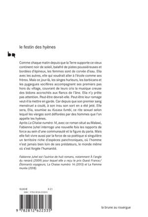 Comme chaque matin depuis que la Terre supporte ce vieux continent noir de soleil, balafré de pistes poussiéreuses et bordées d'épineux, les femmes sont de corvée d'eau. Elia avec les autres, elle qui voudrait aller à l'école comme ses frères. Mais ce jour- là, les singes hurleurs, les barbicans et les pygargues vocifères accompagnent ses premiers pas hors du village, couvrant de leurs cris la musique creuse des bidons accrochés aux flancs de l'âne. Elia n'y prête pas attention. Peut-être devrait-elle. Peut-être leur ramage veut-il la mettre en garde. Car depuis que son premier sang menstruel a coulé, à son insu son sort en a été jeté. Elle sera, Elia, soumise au Kusasa fumbi, ce rite sexuel selon lequel les vierges sont déflorées par des hommes que l'on appelle les hyènes. Après La Chaise numéro 14, avec ce roman situé au Malawi, Fabienne Juhel interroge une nouvelle fois les rapports de force au sein d'une communauté et la figure du paria. Mais elle fait vivre aussi par la force de sa poétique si singulière un territoire riche d'espèces panchroniques, où l'homme n'est jamais bien loin de ses prédateurs, le monde même où s'est forgée l'humanité.