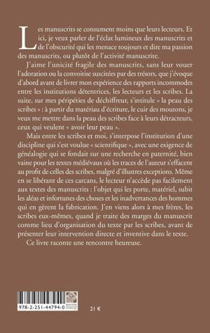 Les manuscrits se consument moins que leurs lecteurs. Et ici, je veux parler de l'eclat lumineux des manuscrits et de l'obscurite qui les menace toujours et dire ma passion des manuscrits, ou plutot de l'activite manuscrite. J'aime l'unicite fragile des manuscrits, sans leur vouer l'adoration ou la convoitise suscitees par des tresors, que j'evoque d'abord avant de livrer mon experience des rapports incommodes entre les institutions detentrices, les lecteurs et les scribes. La suite, sur mes peripeties de dechiffreur, s'intitule la peau des scribes a partir du materiau d'ecriture, le cuir des moutons, je veux me mettre dans la peau des scribes face a leurs detracteurs, ceux qui veulent avoir leur peau . Mais entre les scribes et moi, s'interpose l'institution d'une discipline qui s'est voulue scientifique, avec une exigence de genealogie qui se fondait sur une recherche en paternite, bien vaine pour les textes medievaux ou les traces de l'auteur s'effacent au profit de celles des scribes, malgre d'illustres exceptions. Meme en se liberant de ces carcans, le lecteur n'accede pas facilement aux textes des manuscrits: l'objet qui les porte, materiel, subit les aleas et infortunes des choses et les inadvertances des hommes qui en gerent la fabrication. J'en viens alors a mes freres, les scribes eux-memes, quand je traite des marges du manuscrit comme lieu d'organisation du texte par les scribes, avant de resenter leur intervention directe et inventive dans le texte. Ce livre raconte une rencontre heureuse.